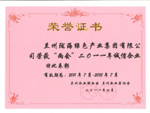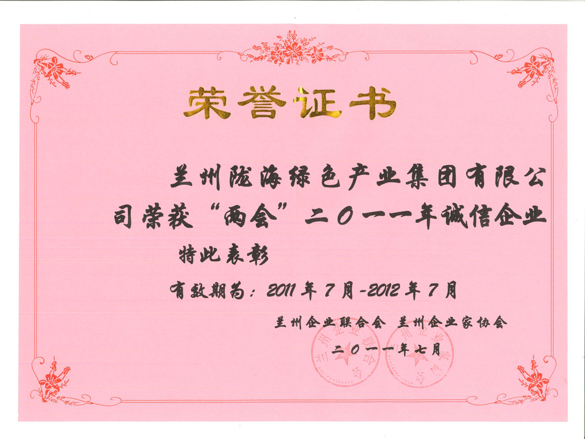 2011年7月20日,由蘭州企業(yè)聯(lián)合會(huì)、蘭州企業(yè)家協(xié)會(huì)常務(wù)理事會(huì)審議,蘭州隴海綠色產(chǎn)業(yè)集團(tuán)有限公司被評(píng)為誠(chéng)信企業(yè)。