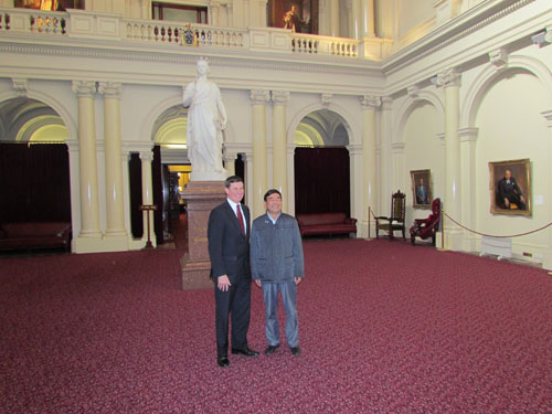 7月29日考察團(tuán)前往墨爾本,由維多利亞州聯(lián)邦自由黨籍資深國會(huì)議員、維多利亞州自由黨地方政府部部長、維多利來州國會(huì)澳中友好協(xié)會(huì)主席Ken Smith MP閣下,中澳城市峰會(huì)執(zhí)行主席、澳大利亞國際商會(huì)首席MICHAEL GUO閣下在貴會(huì)大廈會(huì)見了考察團(tuán)一行,雙方就促進(jìn)中澳交流與合作,企業(yè)發(fā)展等方面進(jìn)行了探討與交流,并在國會(huì)大廈設(shè)宴招待了考察團(tuán)一行。墨爾本位于澳大利亞的東南部,是個(gè)港口城市,總面積8831平方公里。墨爾本是澳大利亞第二大城市,是有「花園之州」美譽(yù)的維多利亞州(Victoria)的首府,也是澳大利亞的工業(yè)重鎮(zhèn)。墨爾本市民大多數(shù)居住在中央商業(yè)區(qū)周邊,大都會(huì)區(qū)共有約四百萬人,澳大利亞聯(lián)邦初立至1927年,墨爾本是澳大利亞的首都,1927年,首都遷往堪培拉。墨爾本的氣候?qū)儆趤啛釒c溫帶交叉型氣候,最熱月通常在22℃以下,最冷月在3℃到15℃之間,終年多雨,屬于溫帶海洋性氣候。