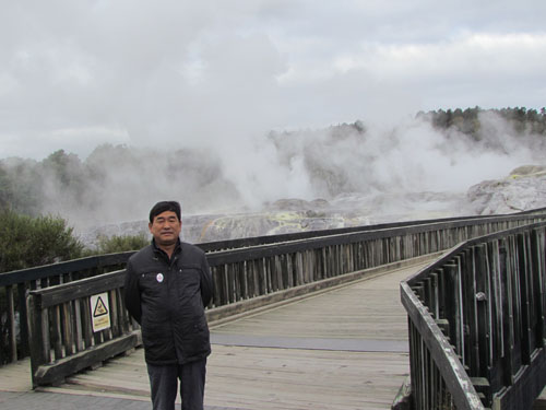 在新西蘭北島中北部工業(yè)城市羅托魯阿湖露天溫泉留影